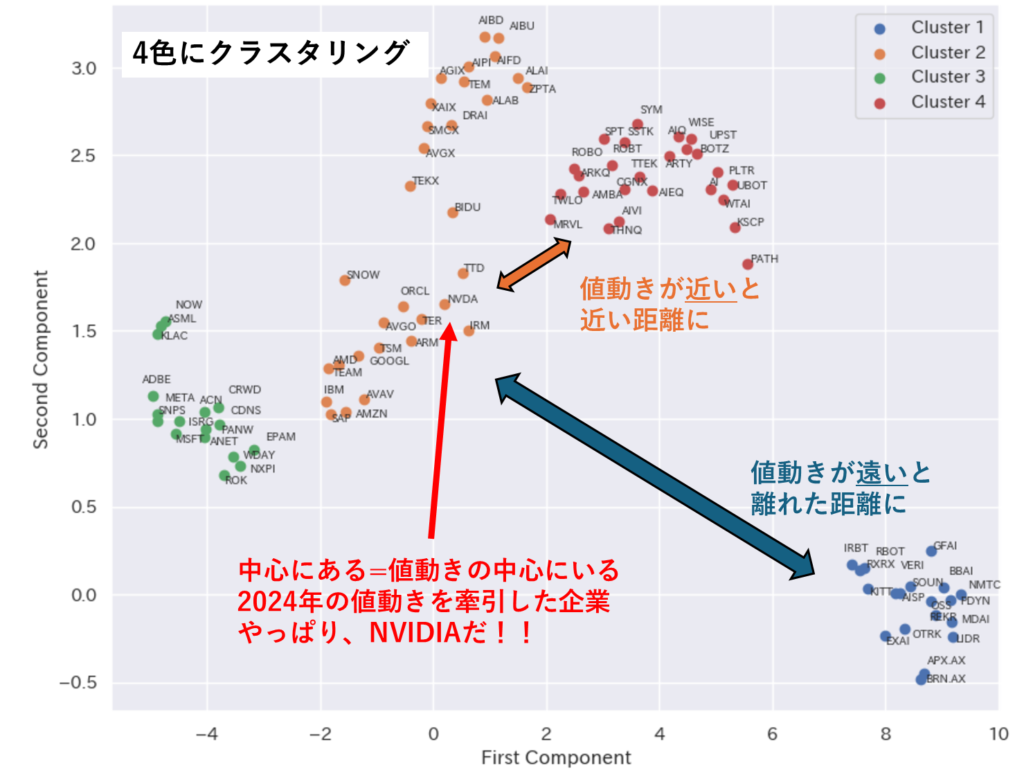 クラスタリングで、値動きが近い銘柄がまとまって表示され、値動きが遠い銘柄は離れた場所に表示されます。